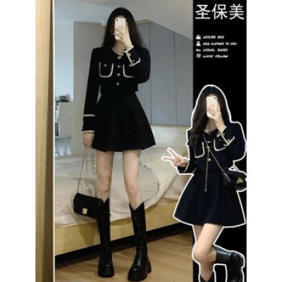 Shengbaomei Small Fragrance Style Suit Dress 2023 New Spring and Autumn Women's Set Skirt Hepburn Style Style Short Skirt Two Black Set M
