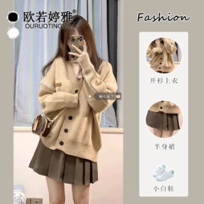 Ou Ruo Ting Ya Autumn/Winter Dress, Women's Small stature, Temperament, Age Reducing Academy Style, Knitted New Pleated Skirt, Korean Fashion Two Piece Cardigan+Pleated Skirt M
