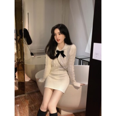 Ou Ruo Ting Ya Knitted Dress Autumn and Winter Small Tall New Academy Style Bow Korean Edition Fashion and Temperament Two piece Set Skirt Off White M