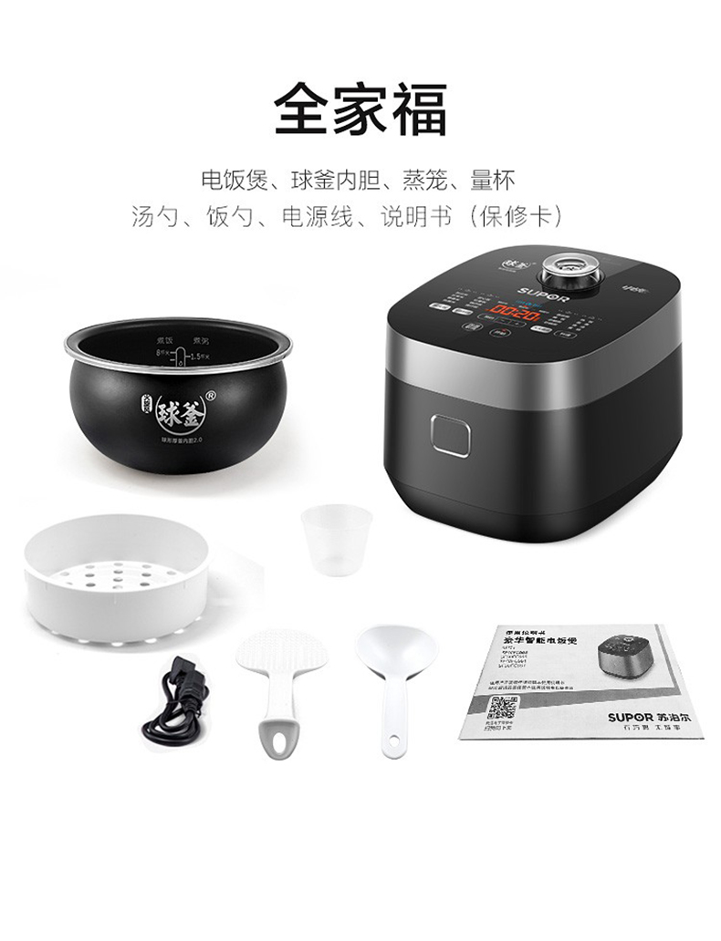 电饭煲主机*1、内胆*1、蒸笼*1、量杯*1、饭勺*1、汤勺*1、电源线*1、说明书*1