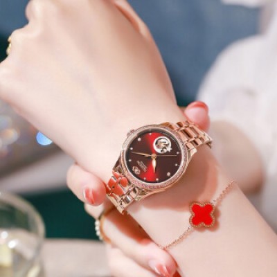 ROSDN Armani Swan Series Women's Watch [New Year Gift for Girlfriend] Light Luxury Diamond Mechanical Watch Little Red Watch [Rainbow Swan] Wine Red+Clover Bracelet
